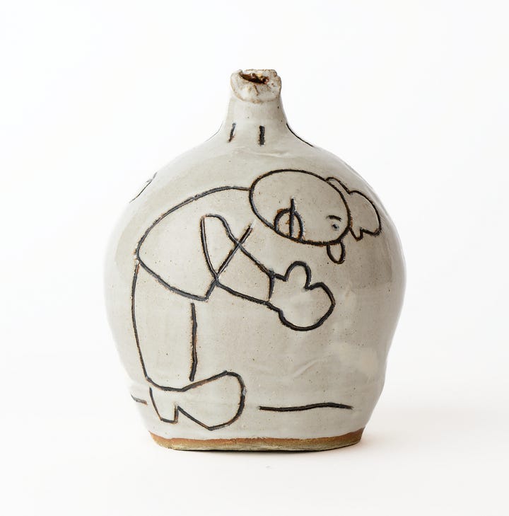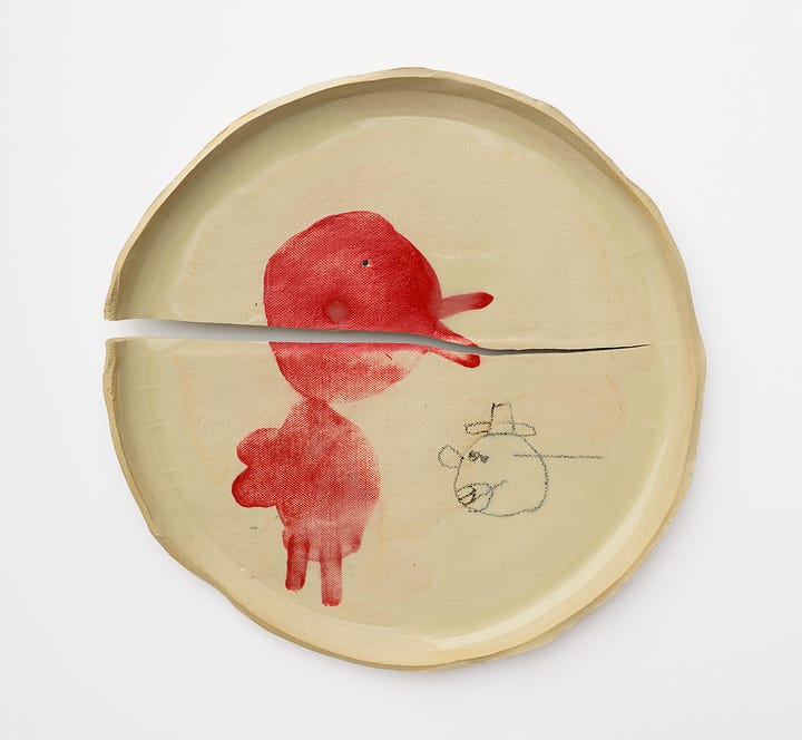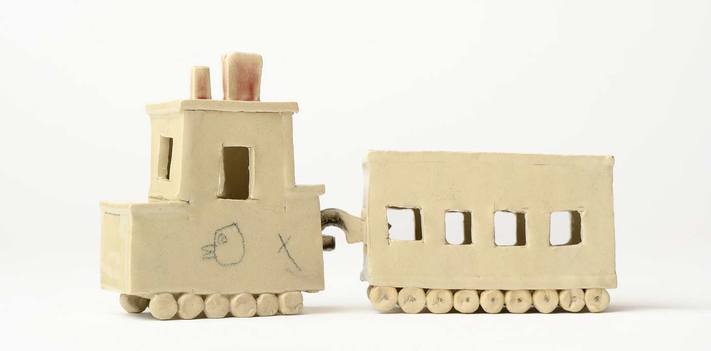 The head (character) repeats itself around the gallery in various scenarios. Glossy ceramics recall the playful clumsiness of school art projects: trains, boats, animals. When I stepped into the Hedenius Gallery last May, I felt a rush of joy — here was art that hadn’t forgotten the importance of play.